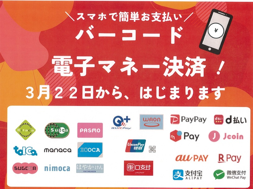 2024年3月22日より、電子マネー・バーコード決済が出来るようになります。