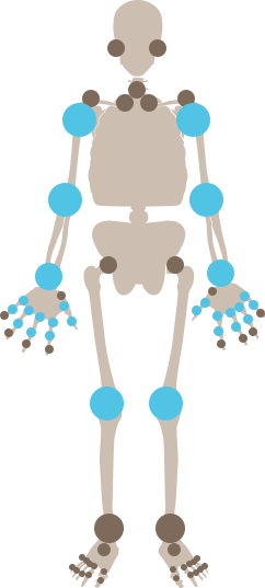 右の図の、青でマークしている節の中で痛い・腫れている関節の数を数えて入力してください。